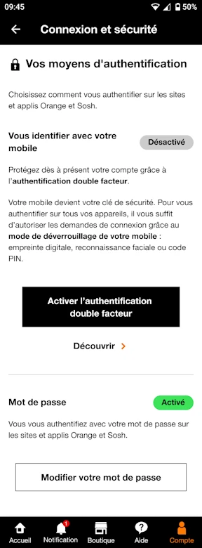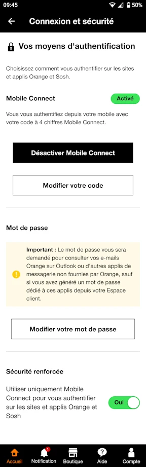 La désactivation de l'authentification renforcée avec Orange et moi vous permet de réutiliser à nouveau votre mot de passe habituel, ce qui reste une solution moins sûre et moins sécurisée pour accéder à votre compte Orange.