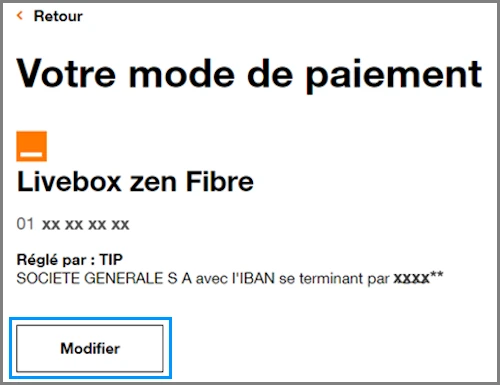- Cliquez sur ce lien modification de mes moyens de paiement, puis sélectionnez le contrat à modifier