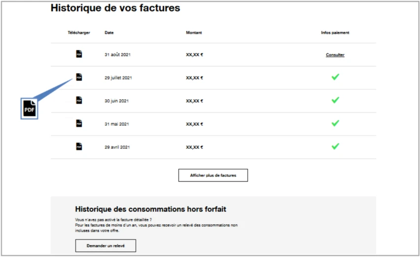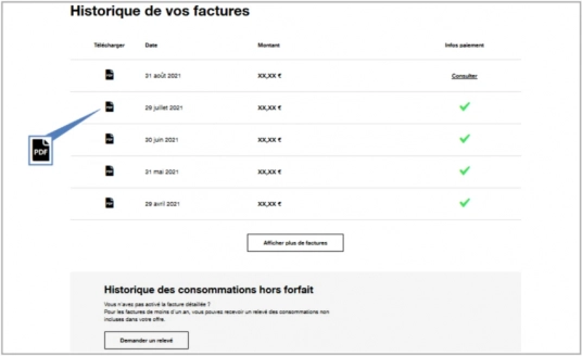 Remarque : les factures sont consultables pendant 24 mois dans votre Espace client. Au delà de ce délai, il vous suffit de demander un duplicata.