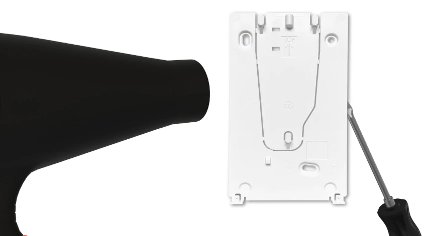 - Si le support mural est fixé par de l'adhésif double-face nous vous recommandons de le chauffer avec un sèche-cheveux pour faciliter son décollement.