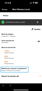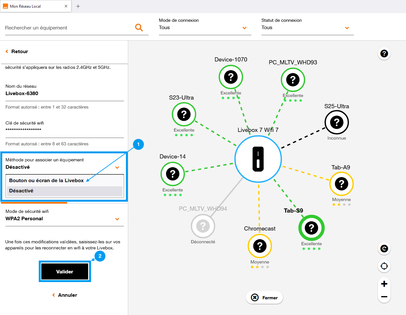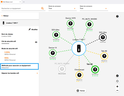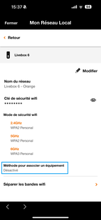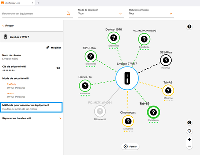 VérifierVérifiez que la méthode pour associer un équipement ne soit plus désactivée avec la mention «Bouton ou écran de la Livebox». |