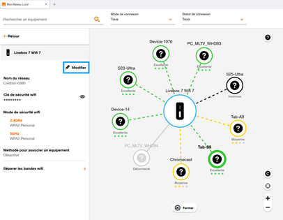 Aller dans les paramètres wifi de la LiveboxDans la rubrique Modifier les réseaux Wifi, cliquez sur le nom de votre réseau wifi. |