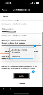 Visualiser la méthode pour associer un équipementVérifiez que la méthode soit positionnée sur «Bouton ou écran de la Livebox». Si la mention « Désactivé» apparait, passez aux étapes suivantes pour la modifier et activer le WPS. |