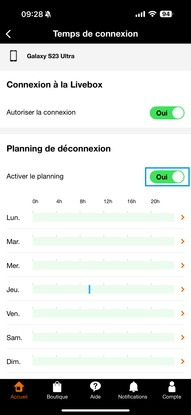 Activer le Planning de déconnexionGlissez le bouton Oui pour activer le planning. les plages horaires de couleur bleu interdisent l'accès à internet de votre équipement. |