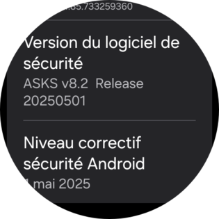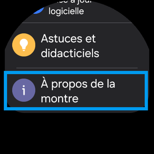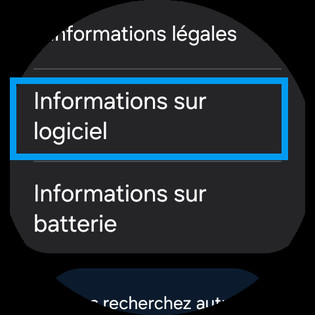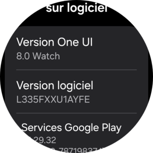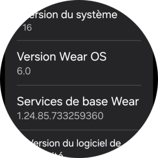 Consultez les infos relatives au logiciel y compris la version de Wear OS. balayez l'écran une troisième fois. |