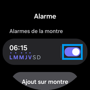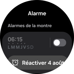 L'alarme désignée est désactivée. pour (ré)activer l'alarme, appuyez à nouveau sur le bouton virtuel (il glissera vers la droite et redeviendra bleu). Nous sommes là pour vous accompagner dans la gestion de vos alarmes et vous assurer une expérience optimale avec votre montre connectée. |