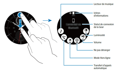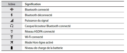 Sur la montre Samsung Gear S2 3G avec carte SIM intégrée, plusieurs icônes sont disponibles pour utiliser des fonctions rapidement ou apparaissent pour vous communiquer des informations.