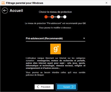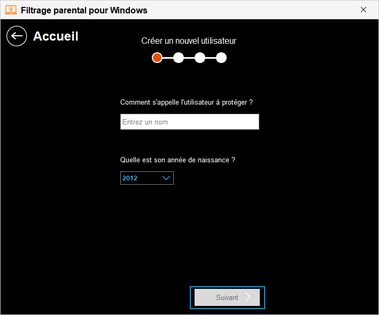 Définir le profil de l'utilisateurcette étape ne s'affiche que si vous avez choisi de créer un compte local au Filtrage Parental.