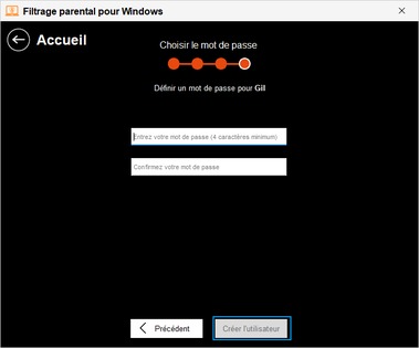 Choisir le mot de passe utilisateurcette étape ne s'affiche que si vous avez choisi de créer un compte local au Filtrage Parental.