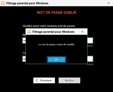 Mot de passe modifiéLe mot de passe Parent du Filtrage Parental a été modifié. Cliquez sur Ok |
