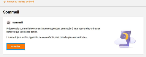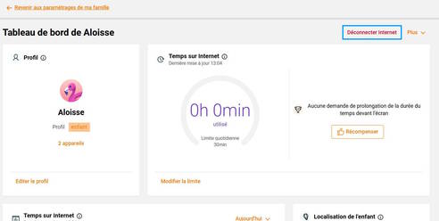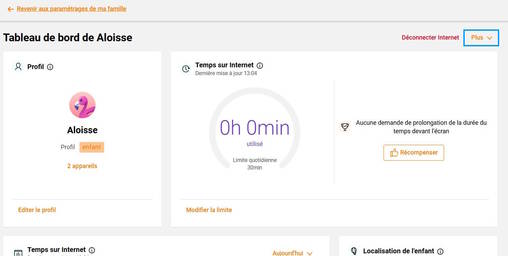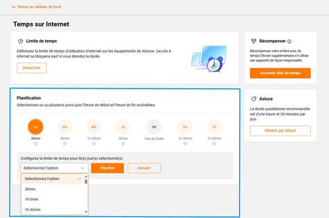 Le temps d’accès à Internet défini dans Temps sur Internet s’ajoute à celui donné pendant une routine. Par exemple, si vous accordez 2 heures dans Temps sur Internet et 1 heure pour la routine Devoirs, l’enfant pourra utiliser Internet jusqu’à 3 heures au total.