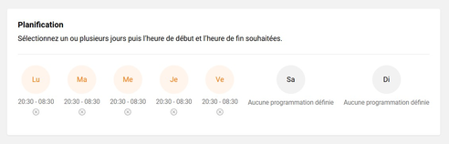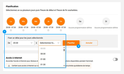 Sélectionner les jours souhaitésChoisissez les jours durant lesquels vous souhaitez activer la routine. le curseur Accès à internet est automatiquement désactivé pour les routines Sommeil et Temps en famille. |