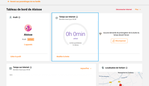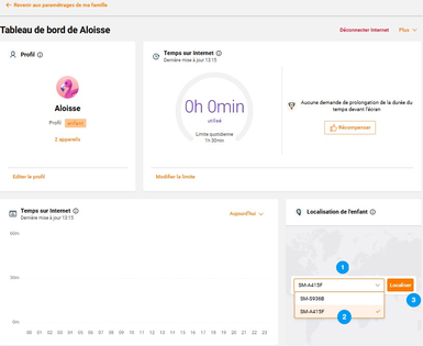 La fonctionnalité de géolocalisation permet de consulter la localisation de chaque équipement mobile/tablette enfant déclaré en toute simplicité. La position affichée correspond à la dernière envoyée par l’appareil, mise à jour toutes les 20 minutes.