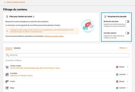 Cette fonctionnalité permet de renforcer la protection de navigation internet en bloquant les contenus pouvant être inadaptés selon l’âge.