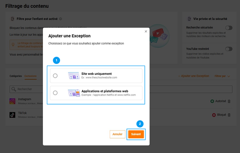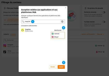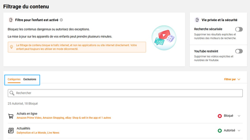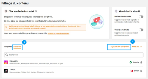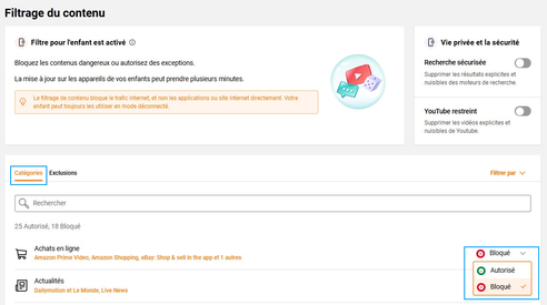 Autoriser ou bloquer certains sites et applicationsLes Catégories : groupe de sites ou applications traitant d’un même thème. Un site ou une application peut être référencée dans plusieurs catégories. certaines catégories listent des sites ou applications de façon non exhaustives. Pour vérifier dans quelle catégorie se trouvent le sites ou l’application, rendez-vous dans l’onglet Exceptions et saisissez son nom. Les Exclusions : traitement unitaire d’une exception pour un site ou une application. Si un site ou une application est présente dans plusieurs catégories, ce sera la règle la plus restrictive de toutes les catégories qui s’appliquera. Si vous avez besoin de vérifier dans quelle(s) catégorie(s) un site ou une application est inclus(e), vous pouvez entrer son contenu dans une « exclusion ». |