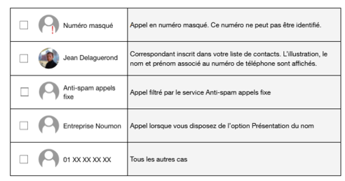 Dans la rubrique Messages vocaux ou Appels manqués les appelants sont affichés de la façon suivante :