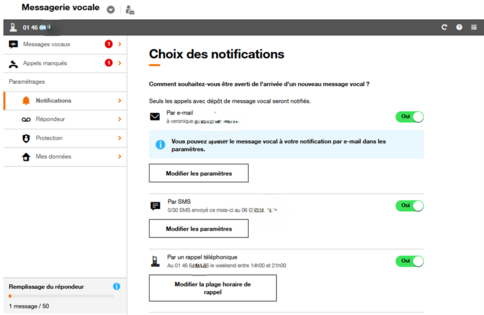 Attention : les notifications des nouveaux messages par mail et par rappel téléphonique sont incluses dans votre offre. Les notifications par SMS sont soumises à la souscription du service Alertes SMS et chaque SMS de notification est alors facturé dans les conditions décrites ci-dessous.
