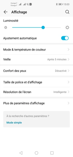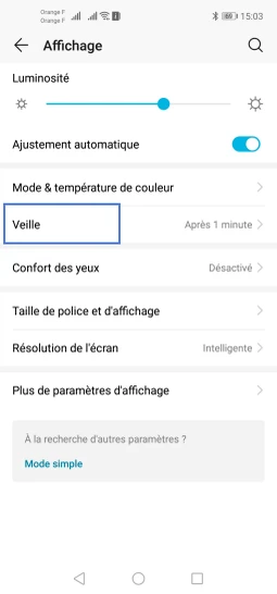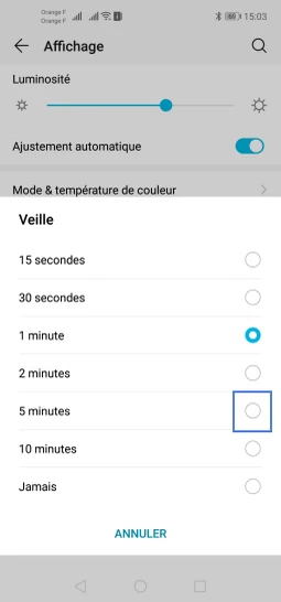 Le mobile affiche et confirme le choix de la temporisation, le mobile se verrouillera automatiquement passé le délai d'inactivité choisi.