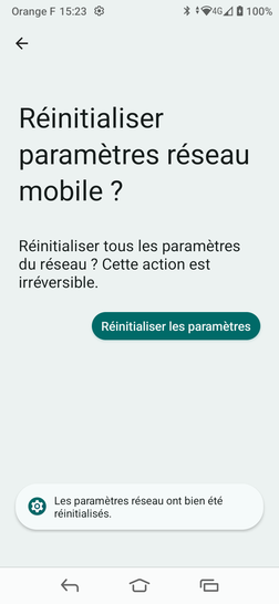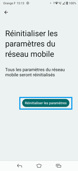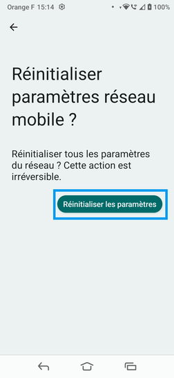 Cette manipulation réinitialisera les réglages réseau mobile et supprimera les connexions et mots de passe Wi-Fi, ainsi que les paramètres Bluetooth. Vos autres données personnelles sont conservées.
