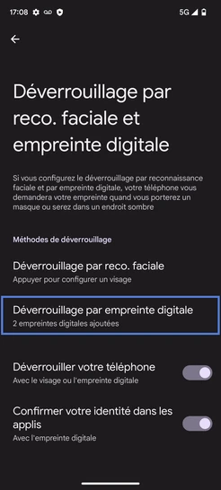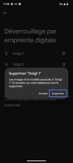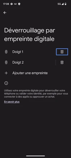 pour votre Google Pixel 7A 5G ou Modifier le téléphone sélectionnéSupprimer une empreinte digitale