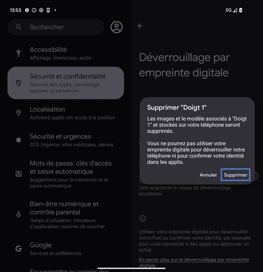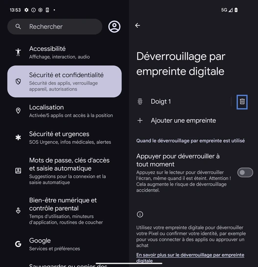 pour votre Google Pixel 9 Pro Fold 5G ou Modifier le téléphone sélectionnéSupprimer une empreinte digitale
