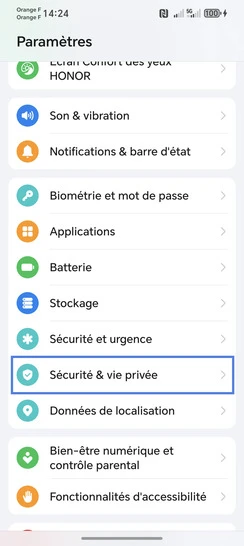 Choisissez Sécurité & vie privée.