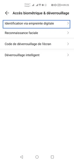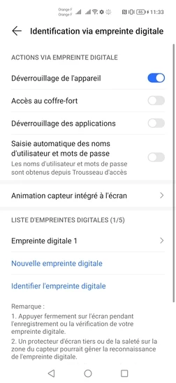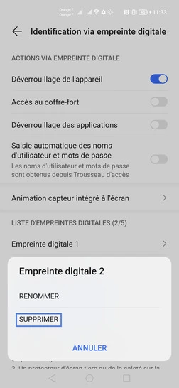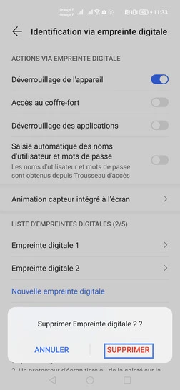 Pour supprimer une empreinte existante, vous devez connaitre le code PIN, le schéma de déverrouillage ou mot de passe de secours choisi lors de l'enregistrement de la première empreinte.