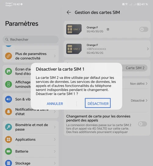 Désactiver le mode dual SIM