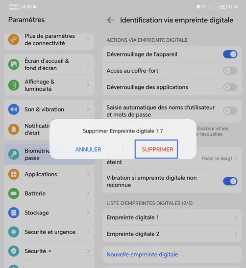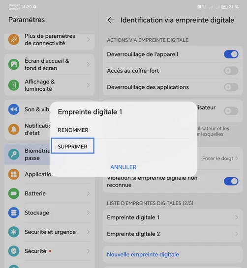 Supprimer une empreinte digitale
