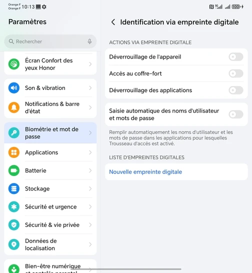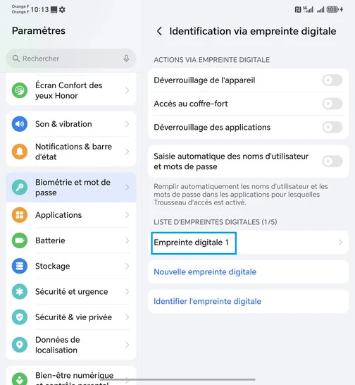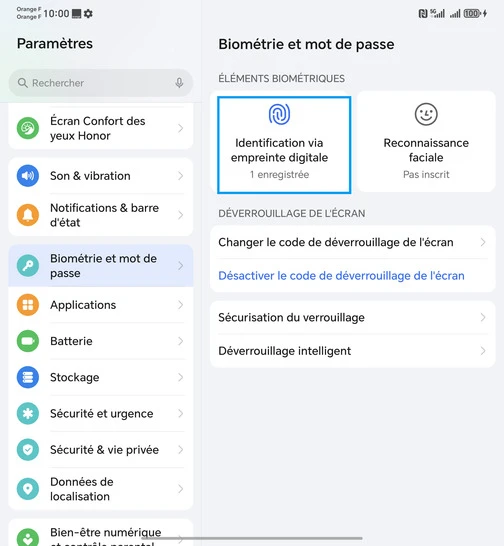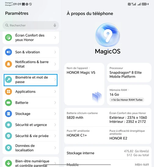 Assurez-vous de connaître le code PIN, le schéma ou le mot de passe de secours de votre mobile Honor Magic V5 5G, car il vous sera demandé pour modifier les paramètres d'empreinte digitale.