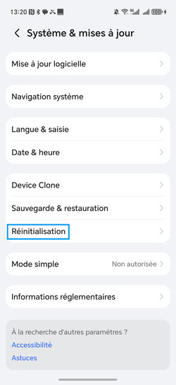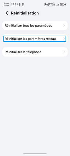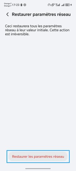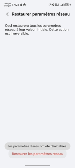 Cette manipulation réinitialisera les réglages réseau mobile et supprimera les connexions et mots de passe Wi-Fi, ainsi que les paramètres Bluetooth. Vos autres données personnelles sont conservées.