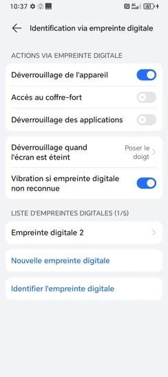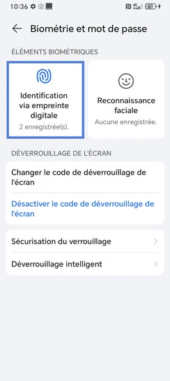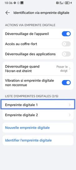 Pour modifier une empreinte existante, vous devez connaître le code PIN, le schéma de déverrouillage ou mot de passe de secours choisi lors de l'activation de la fonctionnalité (enregistrement de la première empreinte).