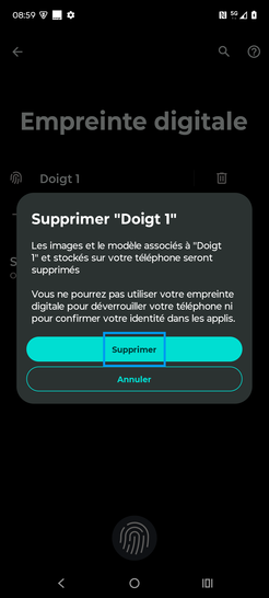 Pour désactiver le déverrouillage par empreinte, vous devez connaitre le code ou le mot de passe que vous avez créé lors de l'enregistrement de la première empreinte. La désactivation du déverrouillage par empreinte digitale consiste à supprimer les empreintes digitales enregistrées dans le mobile.