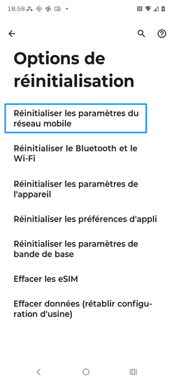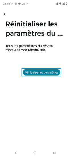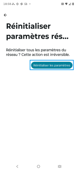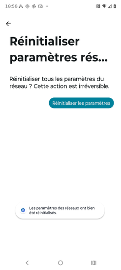 Cette manipulation réinitialisera les réglages réseau mobile et supprimera les connexions et mots de passe Wi-Fi, ainsi que les paramètres Bluetooth. Vos autres données personnelles sont conservées.