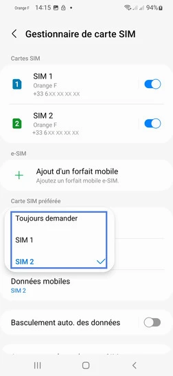 pour votre Samsung Galaxy S22+ 5G ou Modifier le téléphone sélectionnéChoisir la carte SIM pour les appels